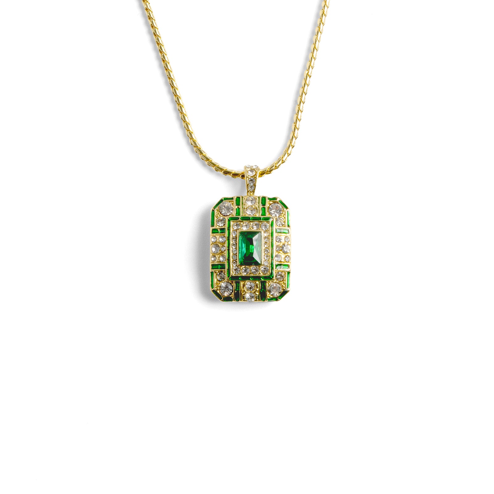 Capture the essence of vintage 1920's glamour with this stunning Art Deco necklace. A radiant emerald-cut crystal takes centre stage, framed by a geometric design adorned with vibrant green enamel and shimmering clear crystals, all set in a polished gold-plated finish. This exquisite pendant hangs elegantly from a 40cm chain, securing with a lobster clasp, offering a touch of timeless sophistication for any neckline.