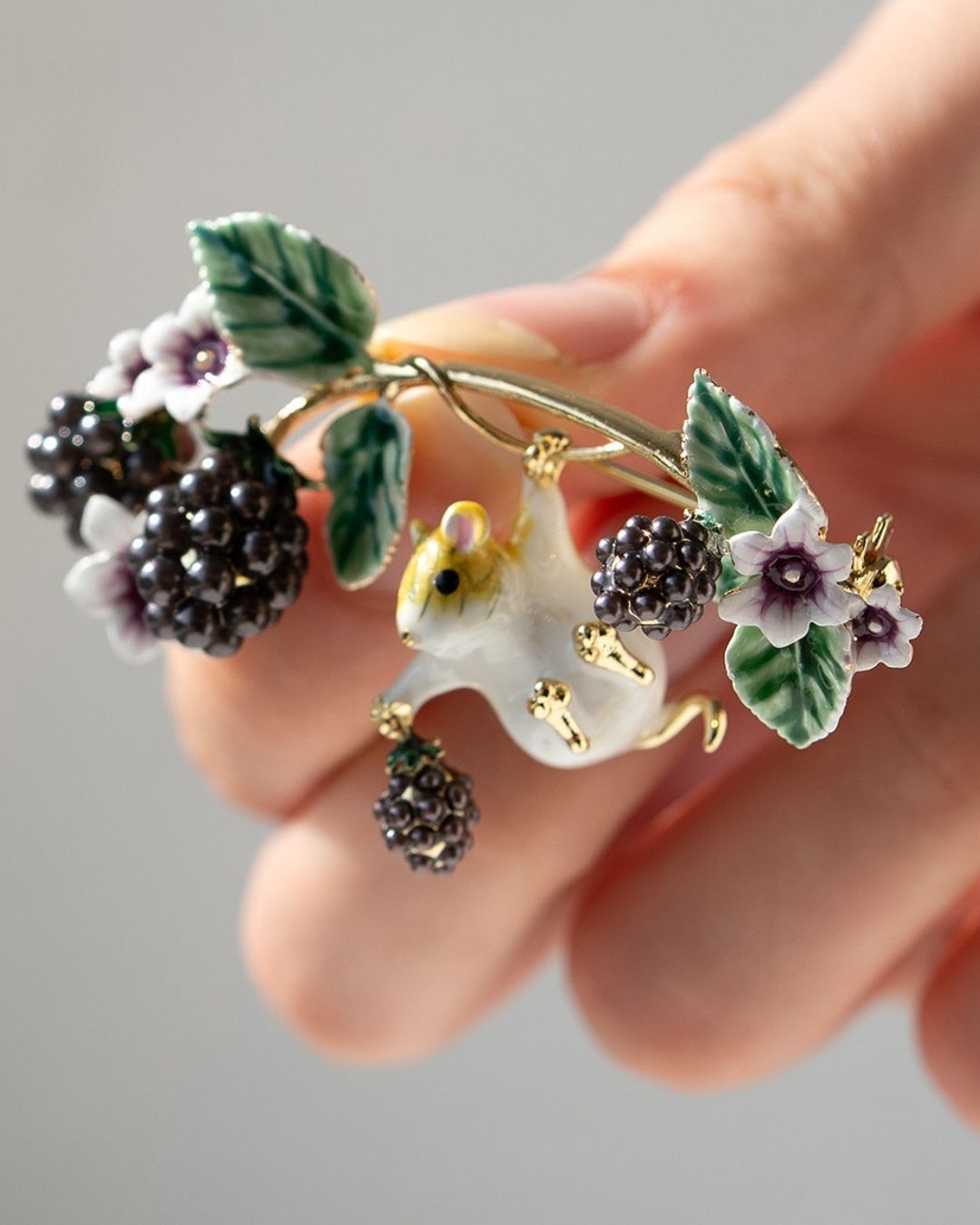 Our enchanting Blackberry and Mouse Brooch is one of Bill Skinner’s most beloved designs — a whimsical celebration of nature’s beauty and charm. At its heart sits our signature adorable field mouse, delicately hand-painted with gold-plated feet and tail, and poised as he clutches a pearlised blackberry, dangling playfully from a golden branch.