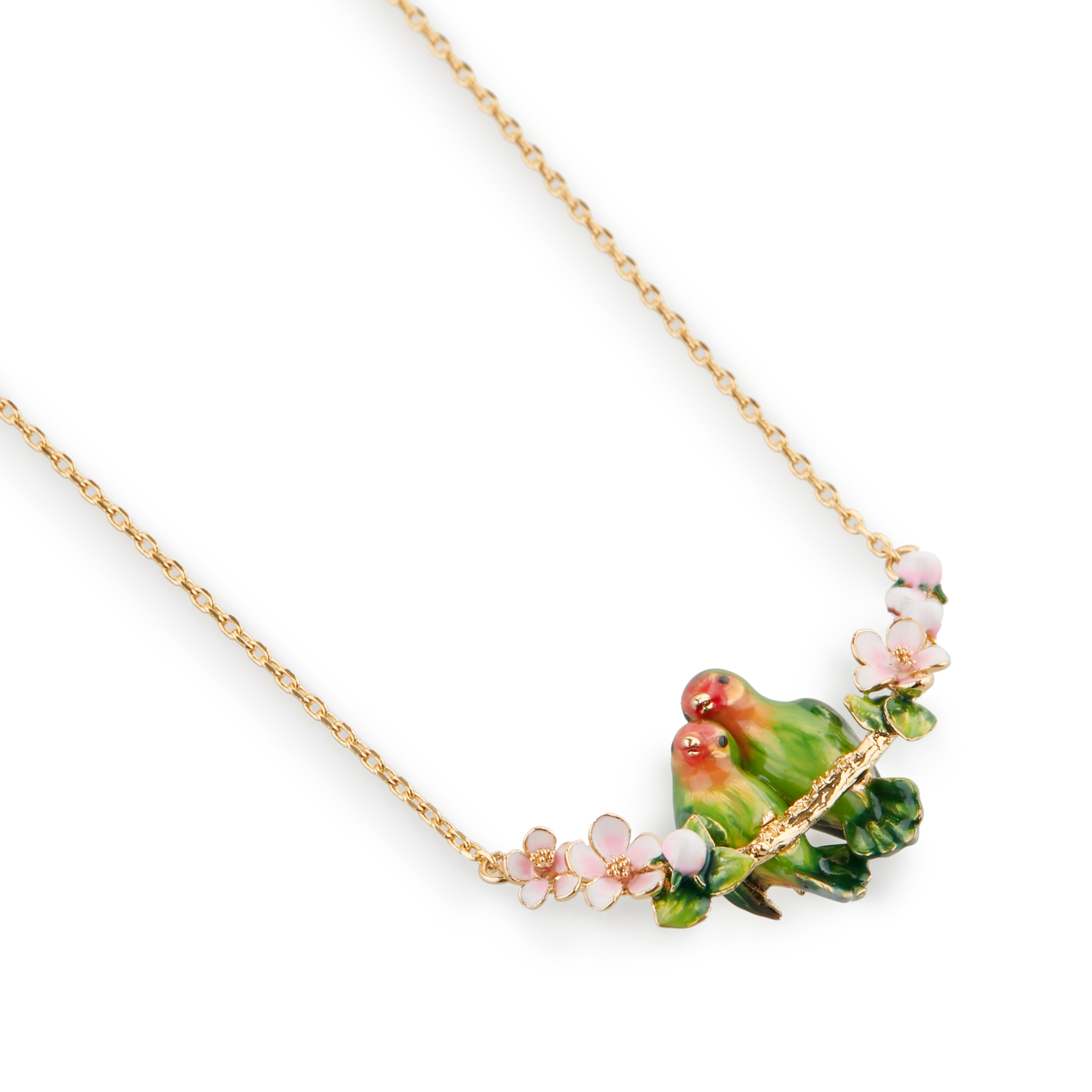 Two delicately hand-painted lovebirds perch on a golden branch, nestled among soft pink blossoms in full bloom. Their intricate detailing and lifelike charm capture the beauty of nature and the timeless sentiment of togetherness. Crafted with care, whether you're gift-giving or treating yourself, this pendant makes a meaningful and heartfelt keepsake. Its whimsical design pairs beautifully with any outfit, adding a touch of romance and elegance to your jewellery collection.