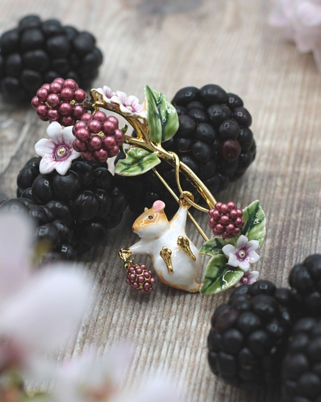 Both enchanting and full of character, this brooch captures the English countryside in a little piece of wearable art. Pin to a lapel, jacket, or scarf and pair with matching pieces from the Blackberry Mouse