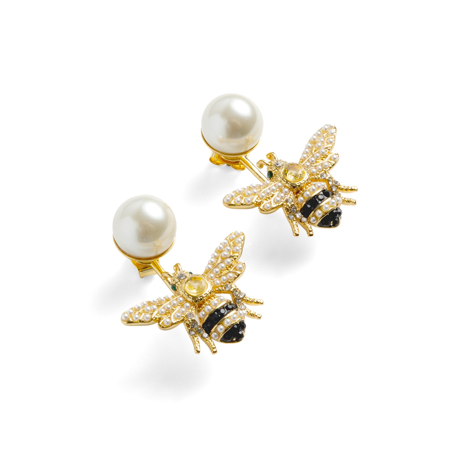 Take flight with these enchanting bee earrings, a sweet nod to nature's busiest pollinators. Each earring features a luminous simulated pearl stud from which a beautifully crafted bee dangles.