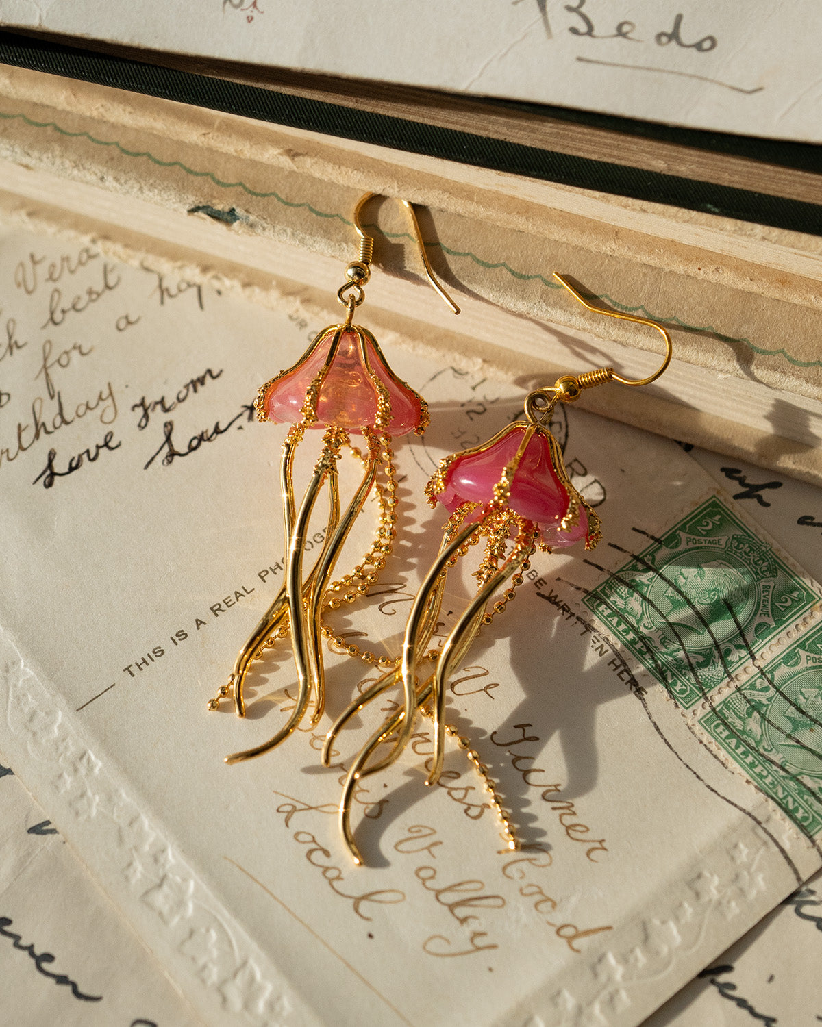 Add a splash of colour with these fun and flirty jellyfish earrings made using a bespoke resin stone with free-moving 18ct gold plated tentacles, suspended from an elegant fish hook.