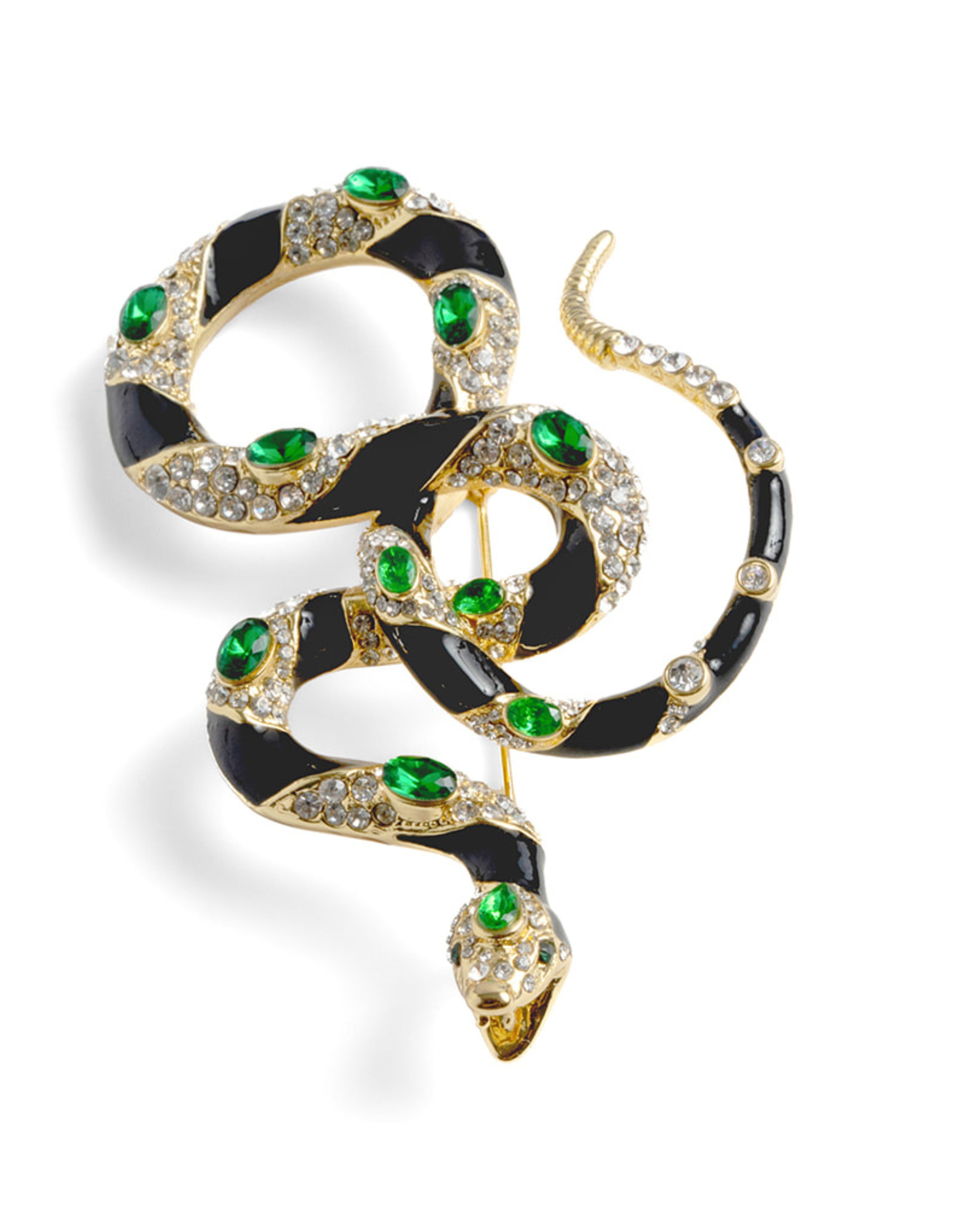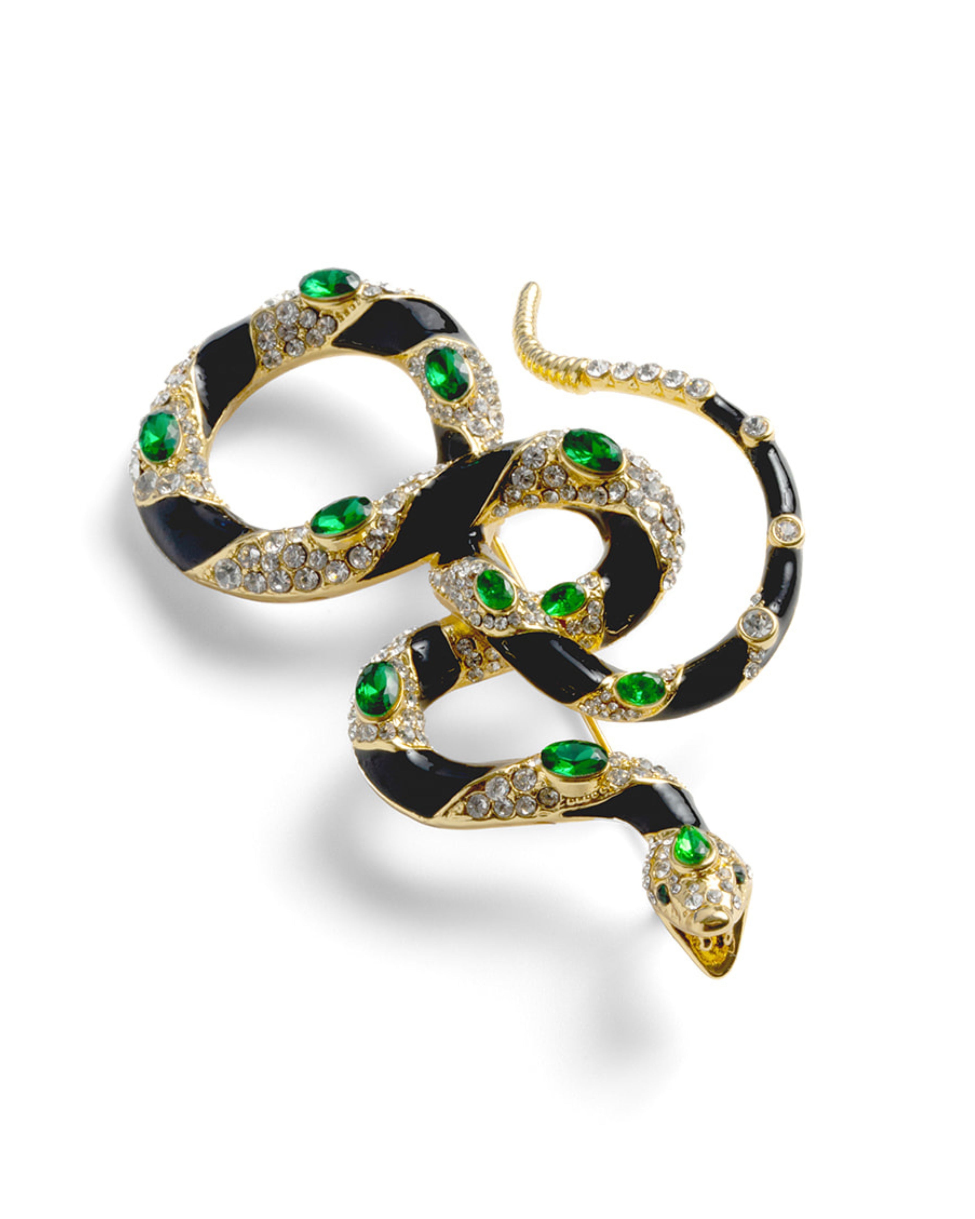 From our Bejewelled collection. An emblem of ancient power and captivating beauty, this Snake Brooch coils with elegant design. Expertly crafted from high-polish 14ct gold-plated brass, its form is accented with rich, hand-painted black enamel. Glistening emerald-green crystals punctuate its curves, and pavé detailing reflect light with every movement.