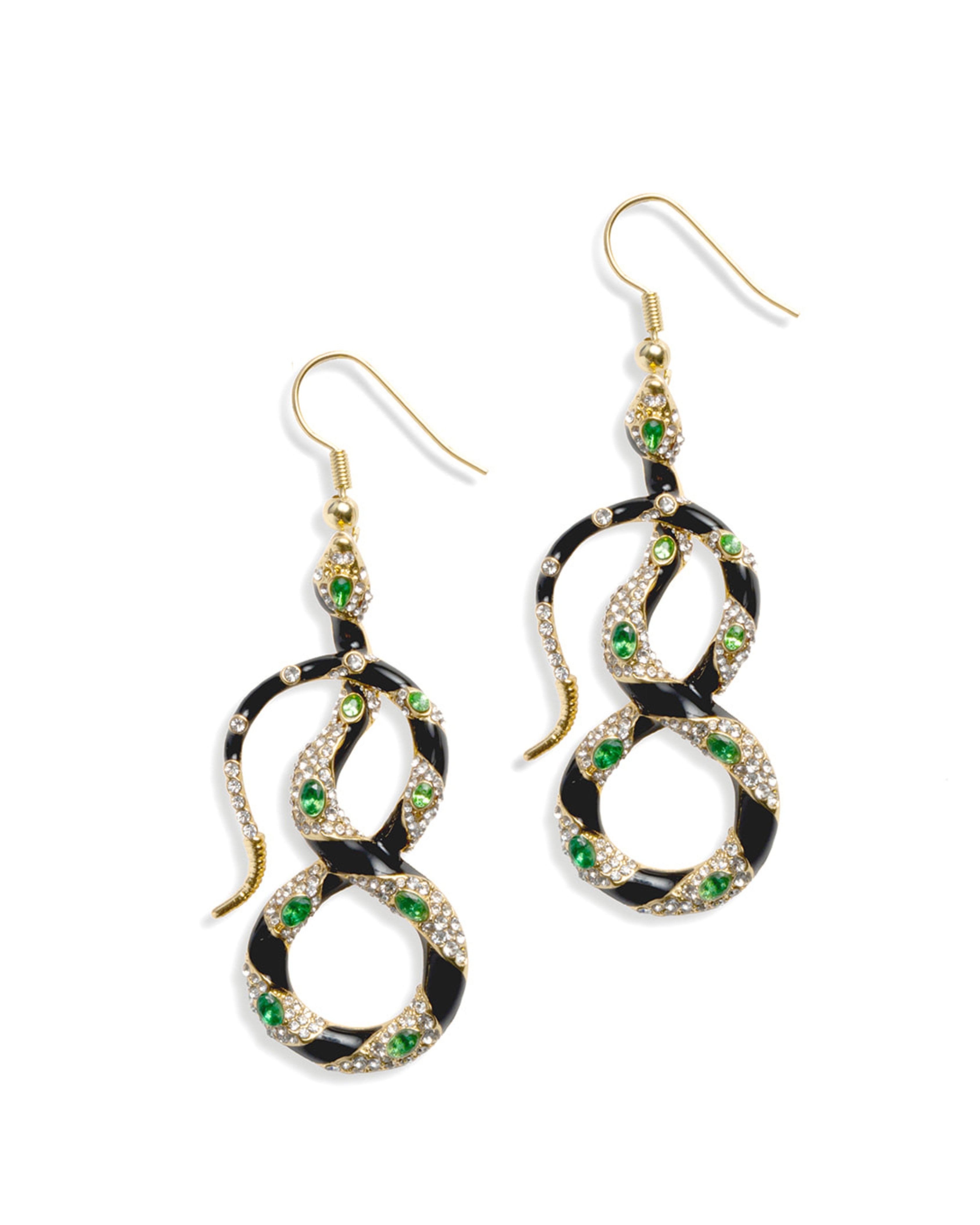 Cascading with ancient charm, these elegant serpent drop earrings echo the captivating allure of the snake. Crafted from high-polish 14ct gold-plating with intricate hand-painted black enamel, they create a striking visual dance. Each curve sits on a fishhook earring is illuminated by shimmering emerald-green crystals, adding a luxurious sparkle.