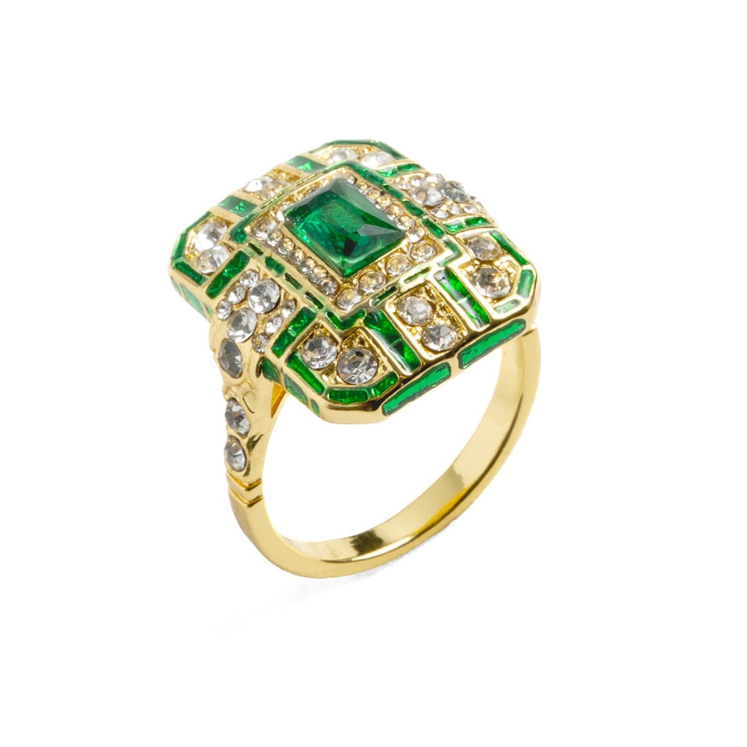The perfect hand-finished 1920's accessory. Its bold, geometric design, finished in polished gold-plated metal, is highlighted by vibrant green enamel. A stunning emerald-cut crystal gleams at its core, surrounded by a radiant pavé of clear crystals that capture the light. This ring offers a touch of opulent sophistication, perfect for a statement of Art Deco style.