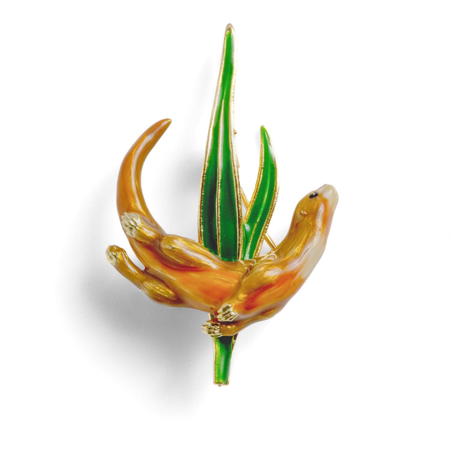 This enchanting otter brooch, a playful celebration of riverside charm. Crafted with a gleaming gold-plated finish, the lively otter is brought to life with intricate hand-painted enamel in warm, natural tones, embracing a vibrant green reed. This charming pin badge captures a moment of tranquility, perfect for adding a touch of character to your favourite jacket or bag.