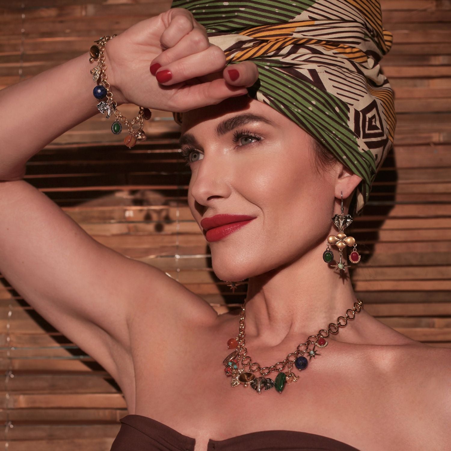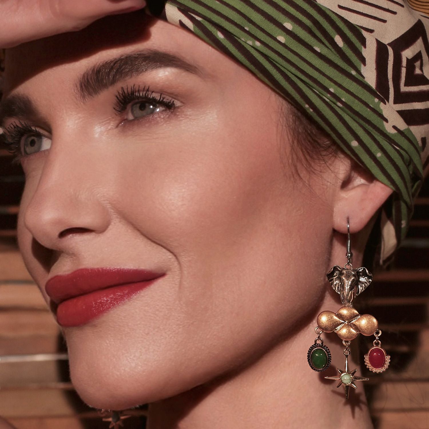 A Trio of Treasures: the Statement Elephant Drop Earrings. Embrace the captivating charm of these statement earrings, a delightful fusion of nature's beauty and Bill Skinner Studio's artistry. Each earring features a trio of treasures: a beautifully sculpted elephant head, a cluster of gleaming charms, and a touch of vibrant colour. The elephant, with its trunk raised in a symbol of strength and good fortune, takes centre stage, while the cascading charms add a playful touch. The pops of colour, from the bold green to the fiery red, create a captivating contrast, making these earrings a true statement piece.